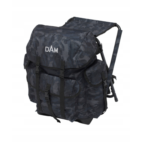 Lekki i bardzo praktyczny plecak wędkarski z siedziskiem DAM Camo świetnie sprawdzi się na szybkie lub niespodziewane wypady na ryby, oraz na te dni, kiedy szukamy ryby w różnych miejscach lub łowiskach. Wykonany z mocnych materiałów plecak wyposażono w pojemną komorę główna ze sznurkiem zaciskowym, jedną pojemną kieszeń z przodu oraz 2 mniejsze kieszenie po bokach. Górny, zamykany panel kieszeni wyposażono w małą kieszonkę oraz pomarańczowy wskaźnik, którego można używać w miejscach, gdzie mogą odbywać się polowania, jako wskaźnika ułatwiającego zobaczenie wędkarza Wszystkie patki kieszeni zapinane zatrzaskami, z regulowanymi taśmami